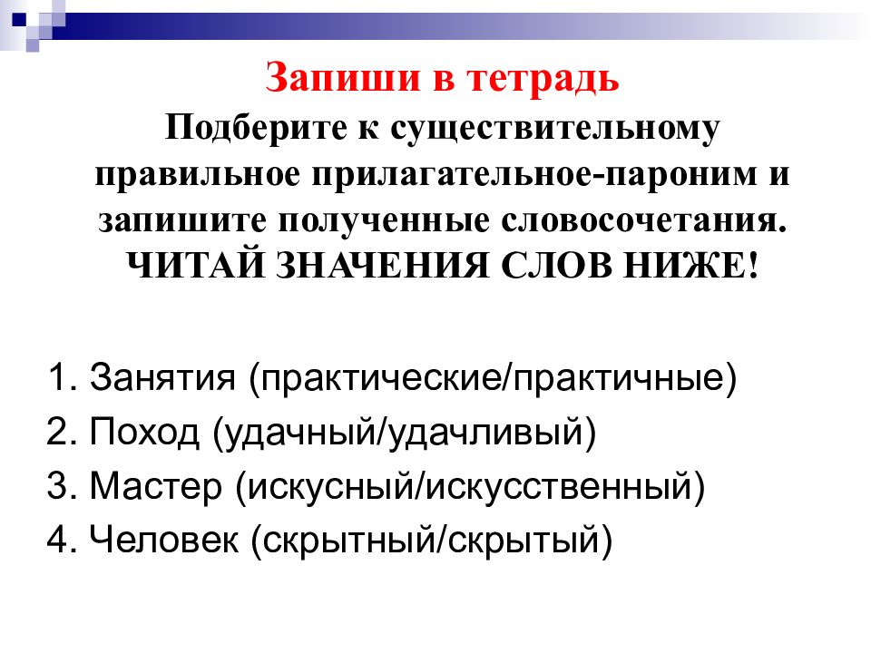 Слайд 14: Запиши в тетрадь Подберите к существительному правильное прилагательное-пароним и запишите полученные словосочетания. ЧИТАЙ ЗНАЧЕНИЯ СЛОВ НИЖЕ!