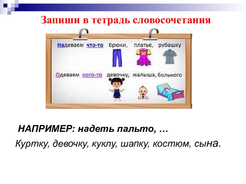 НАПРИМЕР: надеть пальто, … Куртку, девочку, куклу, шапку, костюм, сы на. Запиши в тетрадь словосочетания