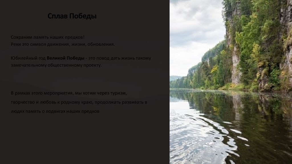 Сохраним память наших предков! Реки это символ движения, жизни, обновления. Юбилейный год Великой Победы - это повод дать жизнь такому замечательному общественному проекту. Сплав Победы В рамках этого мероприятия, мы хотим через туризм, творчество и любовь к родному краю, продолжать развивать в людях память о подвигах наших предков