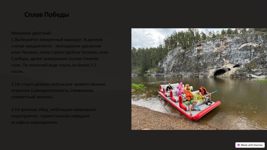 Сплав Победы Механика действий: 1.Выбирается конкретный маршрут. В данном случае предлагается - легендарная уральская река Чусовая, точка страта турбаза Чусовая, село Слобода, далее завершение сплава Нижнее село. По весенней воде плыть не более 3,5 часов. 2.На старте делаем небольшое приветственное открытие (самодеятельность, символизм, совместный завтрак) 3.На финише обед, небольшое командное мероприятие, торжественная передача эстафеты мероприятия.