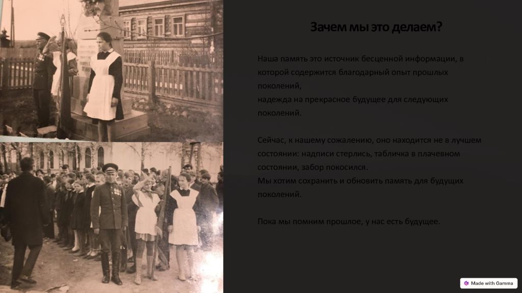 Зачем мы это делаем? Наша память это источник бесценной информации, в которой содержится благодарный опыт прошлых поколений, надежда на прекрасное будущее для следующих поколений. Сейчас, к нашему сожалению, оно находится не в лучшем состоянии: надписи стерлись, табличка в плачевном состоянии, забор покосился. Мы хотим сохранить и обновить память для будущих поколений. Пока мы помним прошлое, у нас есть будущее.