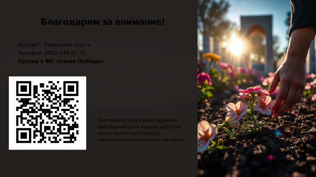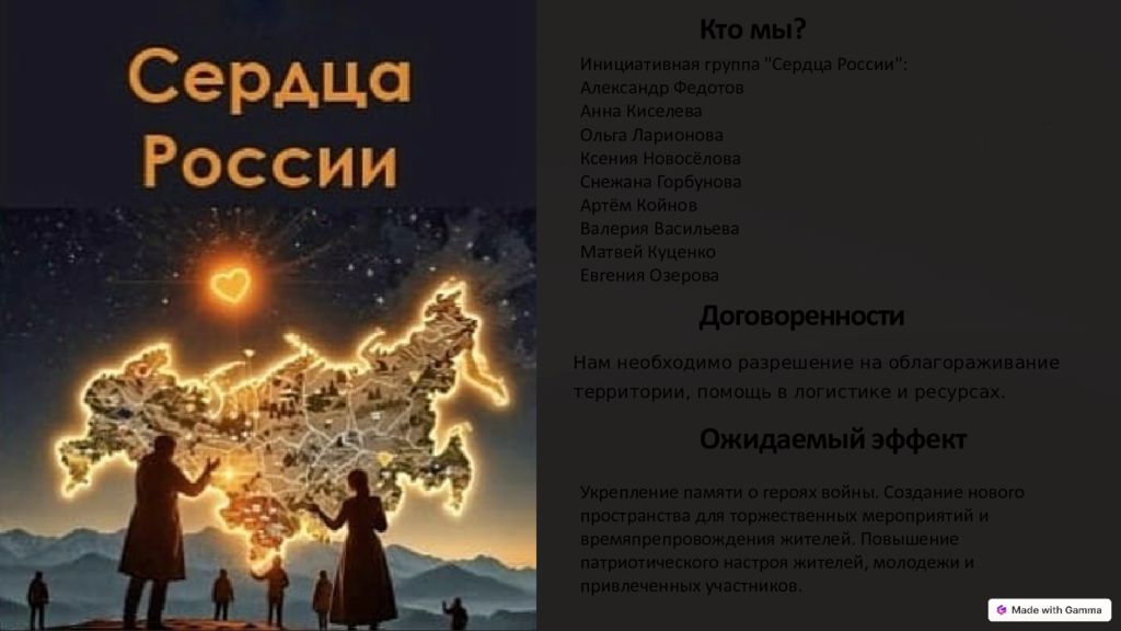 Кто мы? Инициативная группа "Сердца России": Александр Федотов Анна Киселева Ольга Ларионова Ксения Новосёлова Снежана Горбунова Артём Койнов Валерия Васильева Матвей Куценко Евгения Озерова Договоренности Нам необходимо разрешение на облагораживание территории, помощь в логистике и ресурсах. Укрепление памяти о героях войны. Создание нового пространства для торжественных мероприятий и времяпрепровождения жителей. Повышение патриотического настроя жителей, молодежи и привлеченных участников. Ожидаемый эффект