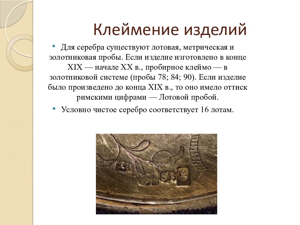Для серебра существуют лотовая, метрическая и золотниковая пробы. Если изделие изготовлено в конце XIX — начале XX в., пробирное клеймо — в золотниковой системе (пробы 78; 84; 90). Если изделие было произведено до конца XIX в., то оно имело оттиск римскими цифрами — Лотовой пробой. Условно чистое серебро соответствует 16 лотам.