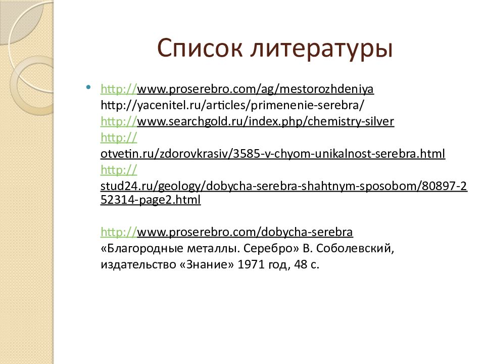 http:// www.proserebro.com/ag/mestorozhdeniya http://yacenitel.ru/articles/primenenie-serebra / http:// www.searchgold.ru/index.php/chemistry-silver http:// otvetin.ru/zdorovkrasiv/3585-v-chyom-unikalnost-serebra.html http:// stud24.ru/geology/dobycha-serebra-shahtnym-sposobom/80897-252314-page2.html http:// www.proserebro.com/dobycha-serebra «Благородные металлы. Серебро» В. Соболевский, издательство «Знание» 1971 год, 48 с.