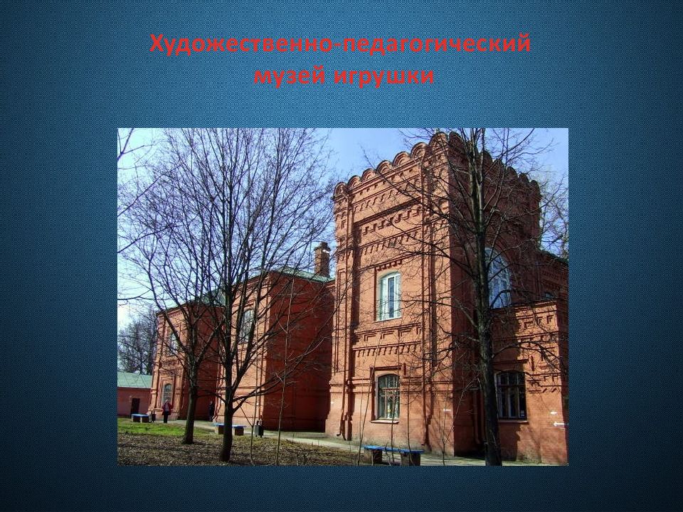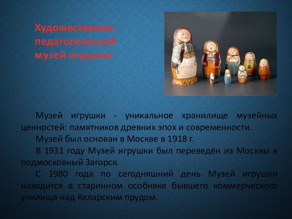 Художественно-педагогический музей игрушки Музей игрушки - уникальное хранилище музейных ценностей: памятников древних эпох и современности. Музей был основан в Москве в 1918 г. В 1931 году Музей игрушки был переведён из Москвы в подмосковный Загорск. С 1980 года по сегодняшний день Музей игрушки находится в старинном особняке бывшего коммерческого училища над Келарским прудом.