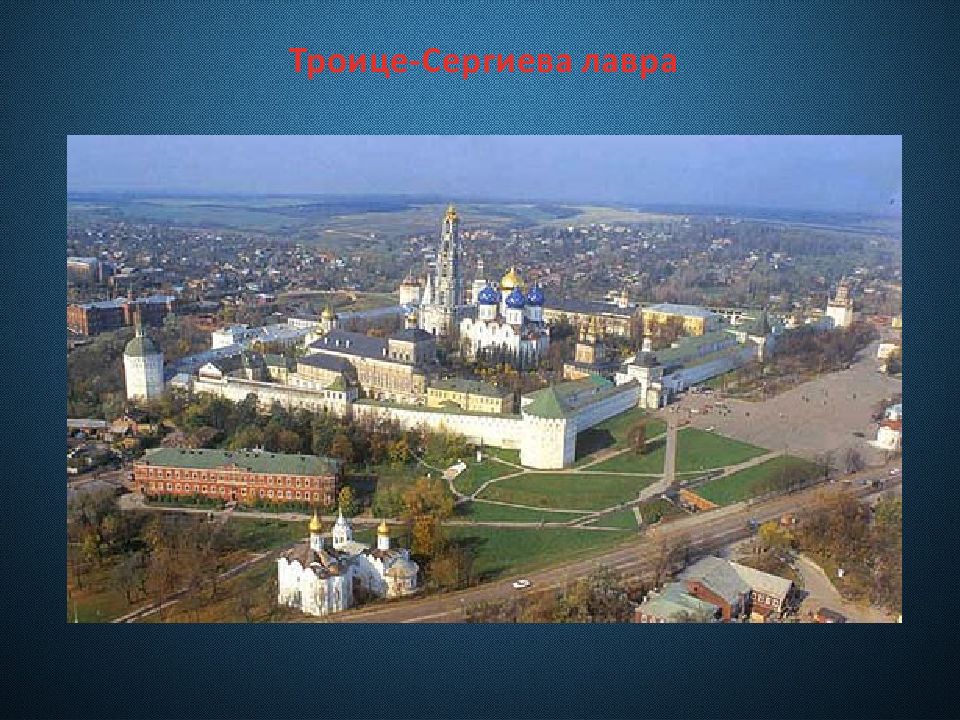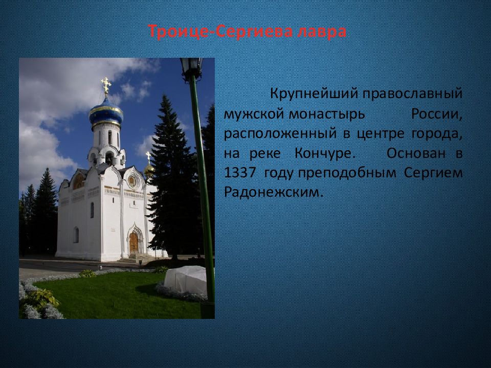 Троице-Сергиева лавра Крупнейший православный мужской монастырь России, расположенный в центре города, на реке Кончуре. Основан в 1337 году преподобным Сергием Радонежским.