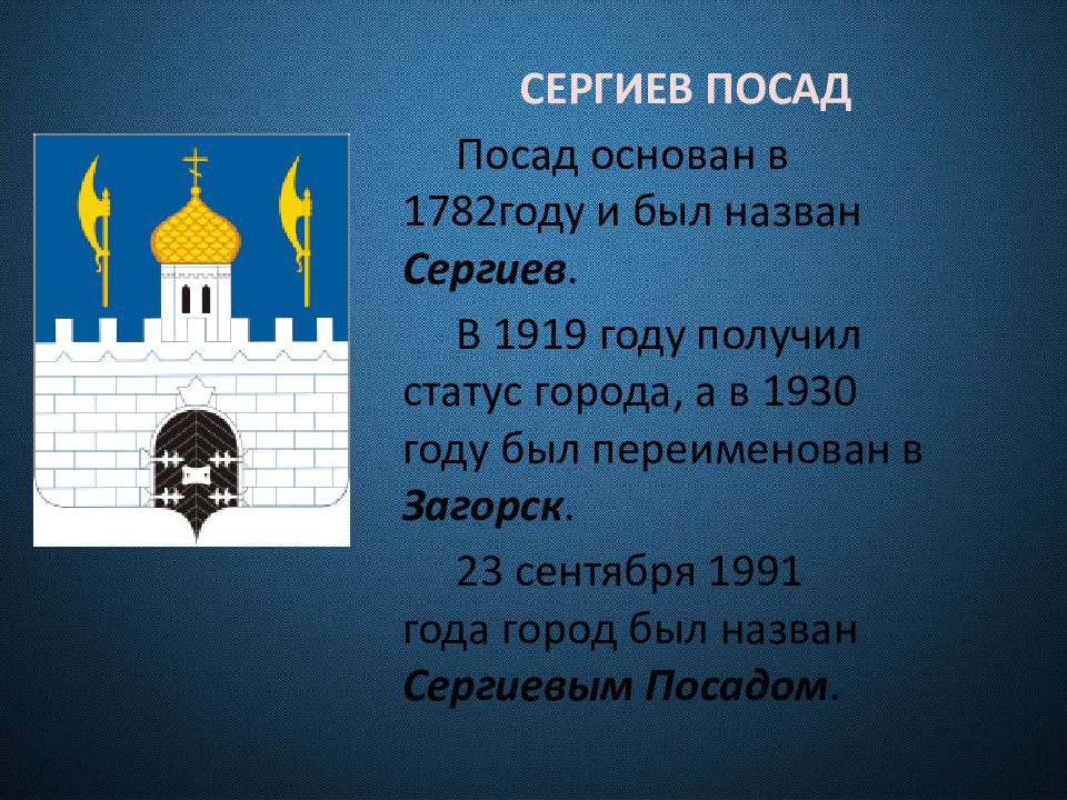 СЕРГИЕВ ПОСАД Посад основан в 1782году и был назван Сергиев. В 1919 году получил статус города, а в 1930 году был переименован в Загорск. 23 сентября 1991 года город был назван Сергиевым Посадом.
