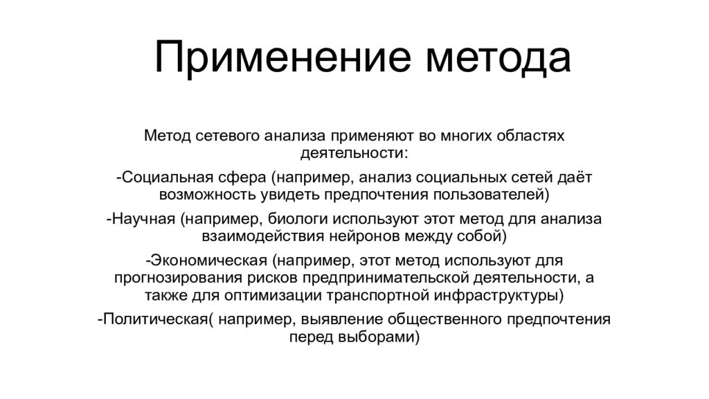 Метод сетевого анализа применяют во многих областях деятельности: -Социальная сфера (например, анализ социальных сетей даёт возможность увидеть предпочтения пользователей) -Научная (например, биологи используют этот метод для анализа взаимодействия нейронов между собой) -Экономическая (например, этот метод используют для прогнозирования рисков предпринимательской деятельности, а также для оптимизации транспортной инфраструктуры) -Политическая( например, выявление общественного предпочтения перед выборами)