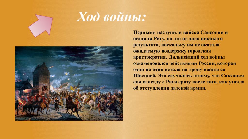 Ход войны: Первыми наступили войска Саксонии и осадили Ригу, но это не дало никакого результата, поскольку им не оказала ожидаемую поддержку городская аристократия. Дальнейший ход войны ознаменовался действиями России, которая один на один встала на тропу войны со Швецией. Это случилось потому, что Саксония сняла осаду с Риги сразу после того, как узнала об отступлении датской армии.