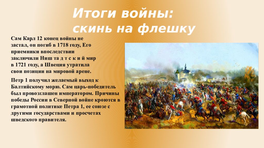 Итоги войны: скинь на флешку Сам Карл 12 конец войны не застал, он погиб в 1718 году, Его приемники впоследствии заключили Ниш та д т с к и й мир в 1721 году, а Швеция утратила свои позиции на мировой арене. Петр 1 получил желаемый выход к Балтийскому морю. Сам царь-победитель был провозглашен императором. Причины победы России в Северной войне кроются в грамотной политике Петра 1, ее союзе с другими государствами и просчетах шведского правителя.