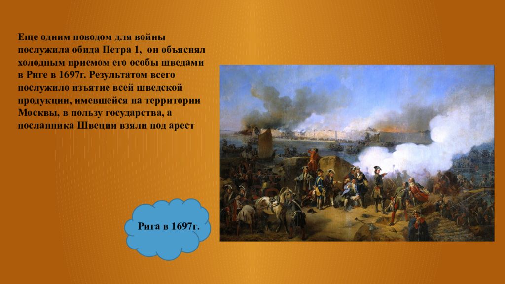 Еще одним поводом для войны послужила обида Петра 1, он объяснял холодным приемом его особы шведами в Риге в 1697г. Результатом всего послужило изъятие всей шведской продукции, имевшейся на территории Москвы, в пользу государства, а посланника Швеции взяли под арест Рига в 1697г.