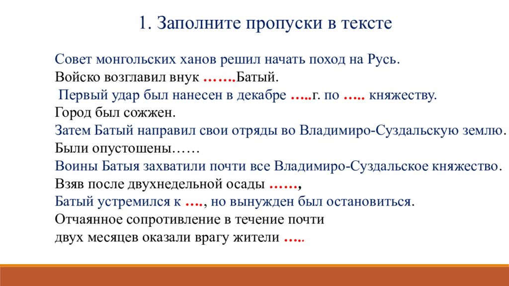 Совет монгольских ханов решил начать поход на Русь. Войско возглавил внук ……. Батый. Первый удар был нанесен в декабре ….. г. по ….. княжеству. Город был сожжен. Затем Батый направил свои отряды во Владимиро-Суздальскую землю. Были опустошены…… Воины Батыя захватили почти все Владимиро-Суздальское княжество. Взяв после двухнедельной осады ……, Батый устремился к …., но вынужден был остановиться. Отчаянное сопротивление в течение почти двух месяцев оказали врагу жители ….. 1. Заполните пропуски в тексте