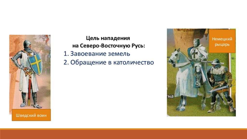 Немецкий рыцарь Шведский воин Цель нападения на Северо-Восточную Русь: Завоевание земель Обращение в католичество