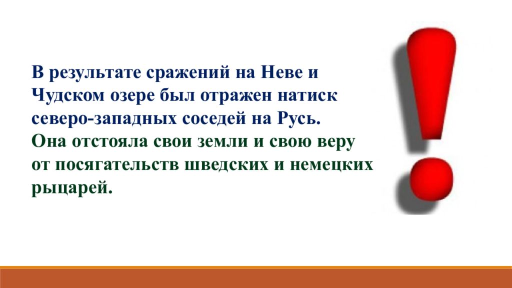 В результате сражений на Неве и Чудском озере был отражен натиск северо-западных соседей на Русь. Она отстояла свои земли и свою веру от посягательств шведских и немецких рыцарей.
