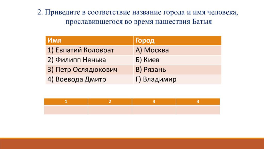 Имя Город 1) Евпатий Коловрат А) Москва 2) Филипп Нянька Б) Киев 3) Петр Ослядюкович В) Рязань 4) Воевода Дмитр Г) Владимир 1 2 3 4 2. Приведите в соответствие название города и имя человека, п рославившегося во время нашествия Батыя