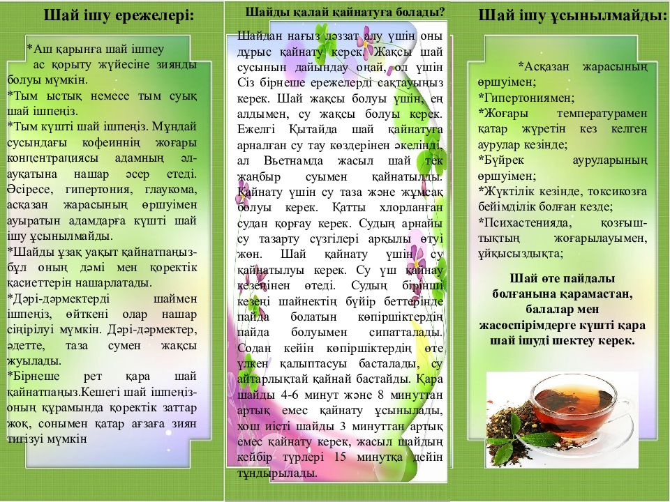 * Аш қарынға шай ішпеу ас қорыту жүйесіне зиянды болуы мүмкін. * Тым ыстық немесе тым суық шай ішпеңіз. * Тым күшті шай ішпеңіз. Мұндай сусындағы кофеиннің жоғары концентрациясы адамның әл-ауқатына нашар әсер етеді. Әсіресе, гипертония, глаукома, асқазан жарасының өршуімен ауыратын адамдарға күшті шай ішу ұсынылмайды. * Шайды ұзақ уақыт қайнатпаңыз-бұл оның дәмі мен қоректік қасиеттерін нашарлатады. *Дәрі-дәрмектерді шаймен ішпеңіз, өйткені олар нашар сіңірілуі мүмкін. Дәрі-дәрмектер, әдетте, таза сумен жақсы жуылады. * Бірнеше рет қара шай қайнатпаңыз.Кешегі шай ішпеңіз-оның құрамында қоректік заттар жоқ, сонымен қатар ағзаға зиян тигізуі мүмкін Шайдан нағыз ләззат алу үшін оны дұрыс қайнату керек. Жақсы шай сусынын дайындау оңай, ол үшін Сіз бірнеше ережелерді сақтауыңыз керек. Шай жақсы болуы үшін, ең алдымен, су жақсы болуы керек. Ежелгі Қытайда шай қайнатуға арналған су тау көздерінен әкелінді, ал Вьетнамда жасыл шай тек жаңбыр суымен қайнатылды. Қайнату үшін су таза және жұмсақ болуы керек. Қатты хлорланған судан қорғау керек. Судың арнайы су тазарту сүзгілері арқылы өтуі жөн. Шай қайнату үшін су қайнатылуы керек. Су үш қайнау кезеңінен өтеді. Судың бірінші кезеңі шайнектің бүйір беттерінде пайда болатын көпіршіктердің пайда болуымен сипатталады. Содан кейін көпіршіктердің өте үлкен қалыптасуы басталады, су айтарлықтай қайнай бастайды. Қара шайды 4-6 минут және 8 минуттан артық емес қайнату ұсынылады, хош иісті ш айды 3 минуттан артық емес қайнату керек, жасыл шайдың кейбір түрлері 15 минутқа дейін тұндырылады. * Асқазан жарасының өршуімен; * Гипертониямен ; * Жоғары температурамен қатар жүретін кез келген аурулар кезінде ; * Бүйрек ауруларының өршуімен; * Жүктілік кезінде, токсикозға бейімділік болған кезде ; * Психастенияда, қозғыш-тықтың жоғарылауымен, ұйқысыздықта ; Шай өте пайдалы болғанына қарамастан, балалар мен жасөспірімдерге күшті қара шай ішуді шектеу керек. Шай ішу ережелері : Шайды қалай қайнатуға болады ? Шай ішу ұсынылмайды: