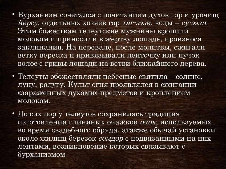 Бурханизм сочетался с почитанием духов гор и урочищ йерсу, отдельных хозяев гор таг-ээзи, воды – су- ээзи. Этим божествам телеутские мужчины кропили молоком и приносили в жертву лошадь, произнося заклинания. На перевале, после молитвы, сжигали ветку вереска и привязывали ленточку или пучок волос с гривы лошади на ветви ближайшего дерева. Телеуты обожествляли небесные святила – солнце, луну, радугу. Культ огня проявлялся в сжигании «зараженных духами» предметов и кроплением молоком. До сих пор у телеутов сохранилась традиция изготовления глиняных очажков очок, используемых во время свадебного обряда, атакже обычай установки около жилищ березок сомдор с подвязанными на них лентами, возникновение которых связывают с бурханизмом