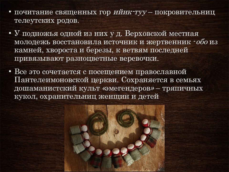 почитание священных гор ийик-туу – покровительниц телеутских родов. У подножья одной из них у д. Верховской местная молодежь восстановила источник и жертвенник - обо из камней, хвороста и березы, к ветвям последней привязывают разноцветные веревочки. Все это сочетается с посещением православной Пантелеимоновской церкви. Сохраняется в семьях дошаманистский культ « эмегендеров » – тряпичных кукол, охранительниц женщин и детей