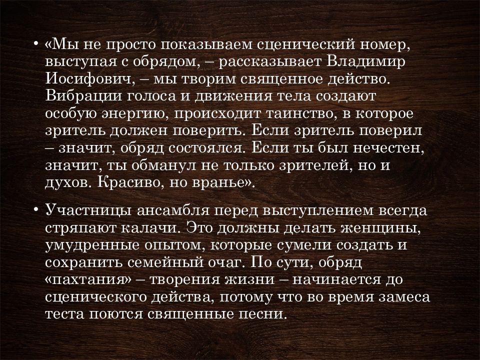 «Мы не просто показываем сценический номер, выступая с обрядом, – рассказывает Владимир Иосифович, – мы творим священное действо. Вибрации голоса и движения тела создают особую энергию, происходит таинство, в которое зритель должен поверить. Если зритель поверил – значит, обряд состоялся. Если ты был нечестен, значит, ты обманул не только зрителей, но и духов. Красиво, но вранье». Участницы ансамбля перед выступлением всегда стряпают калачи. Это должны делать женщины, умудренные опытом, которые сумели создать и сохранить семейный очаг. По сути, обряд « пахтания » – творения жизни – начинается до сценического действа, потому что во время замеса теста поются священные песни.