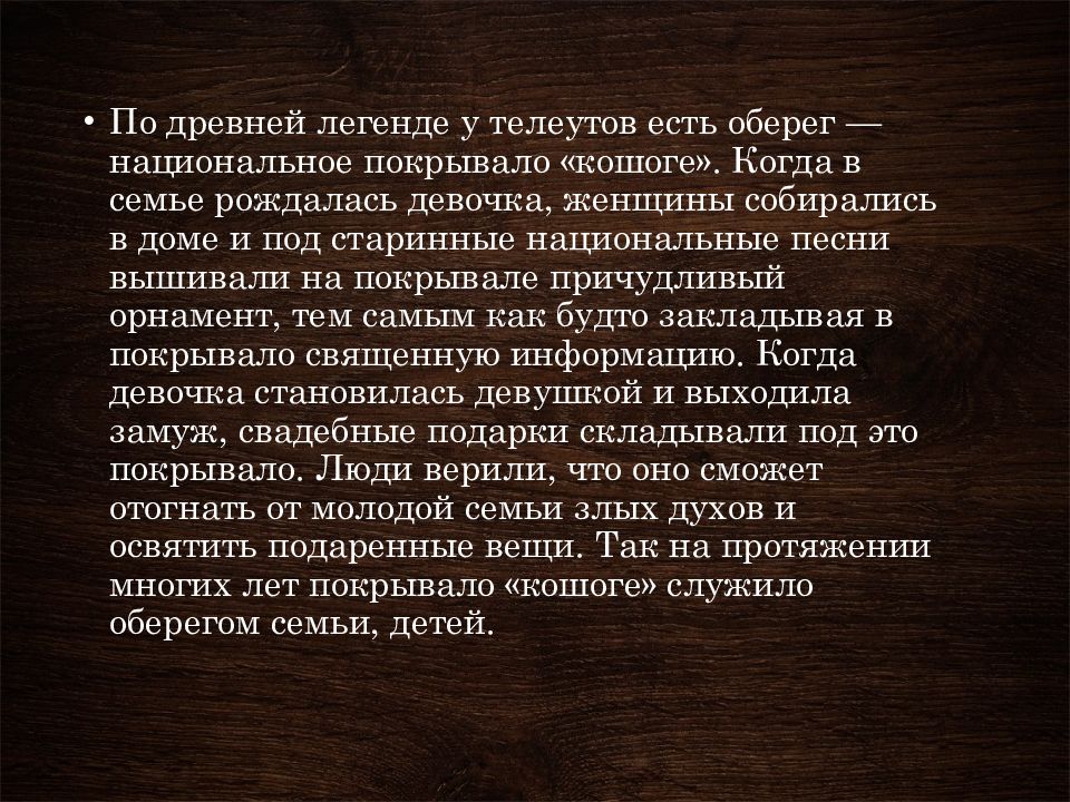 По древней легенде у телеутов есть оберег — национальное покрывало « кошоге ». Когда в семье рождалась девочка, женщины собирались в доме и под старинные национальные песни вышивали на покрывале причудливый орнамент, тем самым как будто закладывая в покрывало священную информацию. Когда девочка становилась девушкой и выходила замуж, свадебные подарки складывали под это покрывало. Люди верили, что оно сможет отогнать от молодой семьи злых духов и освятить подаренные вещи. Так на протяжении многих лет покрывало « кошоге » служило оберегом семьи, детей.