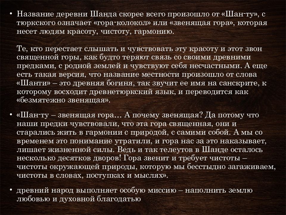 Название деревни Шанда скорее всего произошло от « Шан -ту», с тюркского означает «гора-колокол» или «звенящая гора», которая несет людям красоту, чистоту, гармонию. Те, кто перестает слышать и чувствовать эту красоту и этот звон священной горы, как будто теряют связь со своими древними предками, с родной землей и чувствуют себя несчастными. А еще есть такая версия, что название местности произошло от слова « Шанти » – это древняя богиня, так звучит ее имя на санскрите, к которому восходит древнетюркский язык, и переводится как «безмятежно звенящая». « Шан -ту – звенящая гора… А почему звенящая? Да потому что наши предки чувствовали, что эта гора священная, они и старались жить в гармонии с природой, с самими собой. А мы со временем это понимание утратили, и гора нас за это наказывает, лишает жизненной силы. Ведь и так телеутов в Шанде осталось несколько десятков дворов! Гора звенит и требует чистоты – чистоты окружающей природы, которую мы бесстыдно загаживаем, чистоты в словах, поступках и мыслях ». древний народ выполняет особую миссию – наполнить землю любовью и духовной благодатью