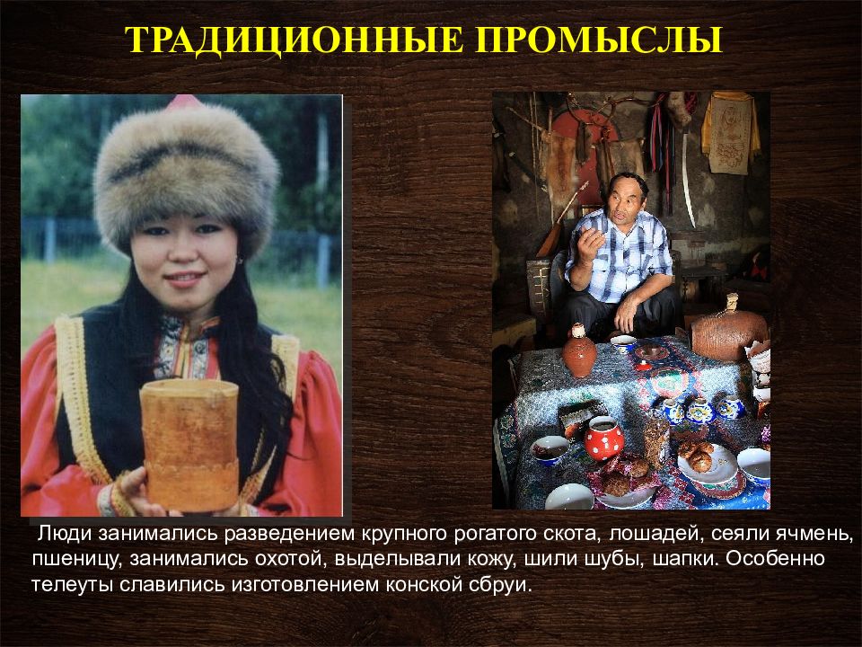 Люди занимались разведением крупного рогатого скота, лошадей, сеяли ячмень, пшеницу, занимались охотой, выделывали кожу, шили шубы, шапки. Особенно телеуты славились изготовлением конской сбруи.
