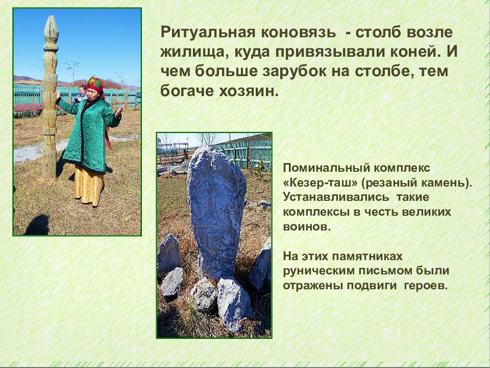 Ритуальная коновязь - столб возле жилища, куда привязывали коней. И чем больше зарубок на столбе, тем богаче хозяин. Поминальный комплекс « Кезер-таш » (резаный камень). Устанавливались такие комплексы в честь великих воинов. На этих памятниках руническим письмом были отражены подвиги героев.