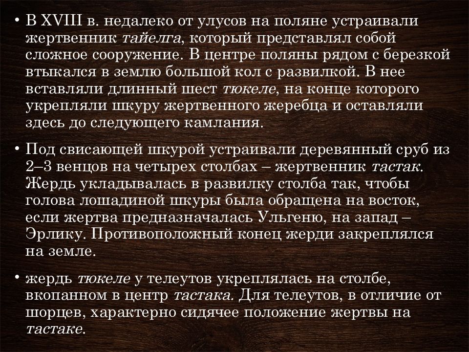 В XVIII в. недалеко от улусов на поляне устраивали жертвенник тайелга, который представлял собой сложное сооружение. В центре поляны рядом с березкой втыкался в землю большой кол с развилкой. В нее вставляли длинный шест тюкеле, на конце которого укрепляли шкуру жертвенного жеребца и оставляли здесь до следующего камлания. Под свисающей шкурой устраивали деревянный сруб из 2–3 венцов на четырех столбах – жертвенник тастак. Жердь укладывалась в развилку столба так, чтобы голова лошадиной шкуры была обращена на восток, если жертва предназначалась Ульгеню, на запад – Эрлику. Противоположный конец жерди закреплялся на земле. жердь тюкеле у телеутов укреплялась на столбе, вкопанном в центр тастака. Для телеутов, в отличие от шорцев, характерно сидячее положение жертвы на тастаке.