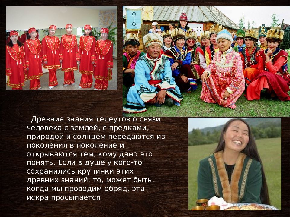 . Древние знания телеутов о связи человека с землей, с предками, природой и солнцем передаются из поколения в поколение и открываются тем, кому дано это понять. Если в душе у кого-то сохранились крупинки этих древних знаний, то, может быть, когда мы проводим обряд, эта искра просыпается