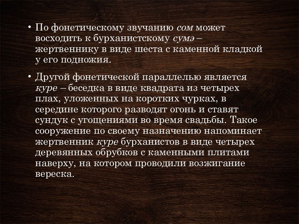 По фонетическому звучанию сом может восходить к бурханистскому сумэ – жертвеннику в виде шеста с каменной кладкой у его подножия. Другой фонетической параллелью является куре – беседка в виде квадрата из четырех плах, уложенных на коротких чурках, в середине которого разводят огонь и ставят сундук с угощениями во время свадьбы. Такое сооружение по своему назначению напоминает жертвенник куре бурханистов в виде четырех деревянных обрубков с каменными плитами наверху, на котором проводили возжигание вереска.