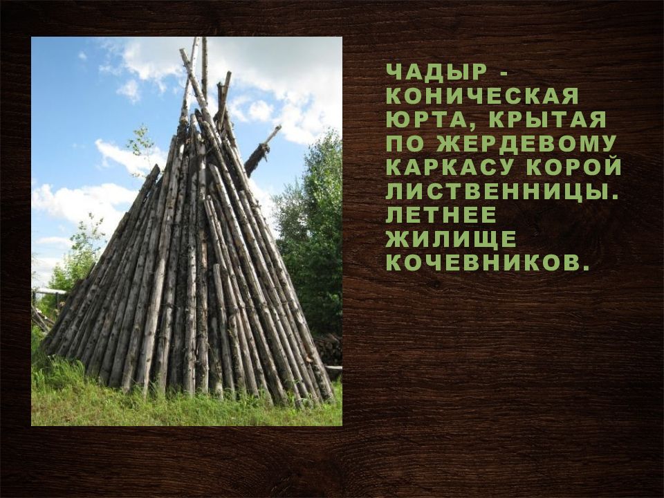 Чадыр - коническая юрта, крытая по жердевому каркасу корой лиственницы. Летнее жилище кочевников.