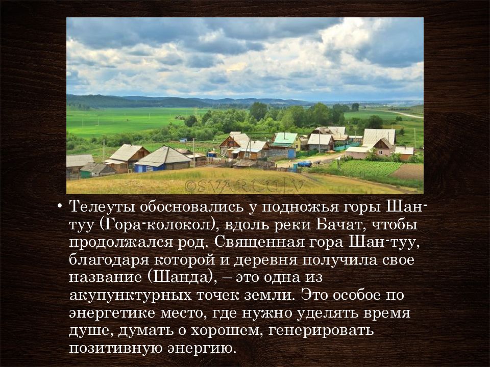 Телеуты обосновались у подножья горы Шан-туу (Гора-колокол), вдоль реки Бачат, чтобы продолжался род. Священная гора Шан-туу, благодаря которой и деревня получила свое название ( Шанда ), – это одна из акупунктурных точек земли. Это особое по энергетике место, где нужно уделять время душе, думать о хорошем, генерировать позитивную энергию.