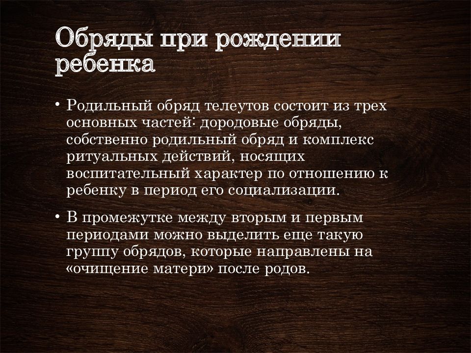 Родильный обряд телеутов состоит из трех основных частей: дородовые обряды, собственно родильный обряд и комплекс ритуальных действий, носящих воспитательный характер по отношению к ребенку в период его социализации. В промежутке между вторым и первым периодами можно выделить еще такую группу обрядов, которые направлены на «очищение матери» после родов.