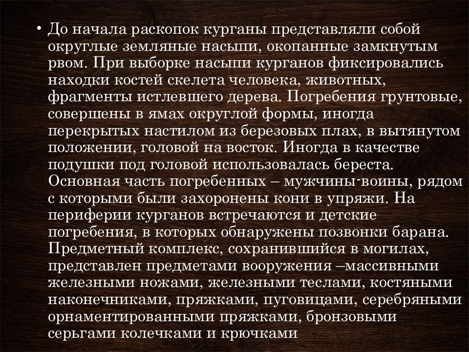 До начала раскопок курганы представляли собой округлые земляные насыпи, окопанные замкнутым рвом. При выборке насыпи курганов фиксировались находки костей скелета человека, животных, фрагменты истлевшего дерева. Погребения грунтовые, совершены в ямах округлой формы, иногда перекрытых настилом из березовых плах, в вытянутом положении, головой на восток. Иногда в качестве подушки под головой использовалась береста. Основная часть погребенных – мужчины-воины, рядом с которыми были захоронены кони в упряжи. На периферии курганов встречаются и детские погребения, в которых обнаружены позвонки барана. Предметный комплекс, сохранившийся в могилах, представлен предметами вооружения –массивными железными ножами, железными теслами, костяными наконечниками, пряжками, пуговицами, серебряными орнаментированными пряжками, бронзовыми серьгами колечками и крючками