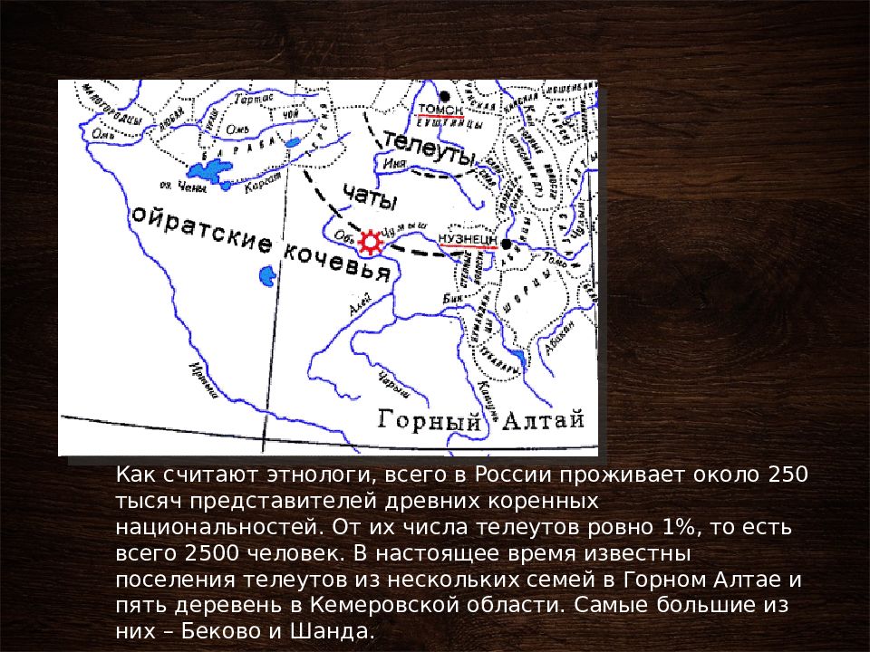 Как считают этнологи, всего в России проживает около 250 тысяч представителей древних коренных национальностей. От их числа телеутов ровно 1%, то есть всего 2500 человек. В настоящее время известны поселения телеутов из нескольких семей в Горном Алтае и пять деревень в Кемеровской области. Самые большие из них – Беково и Шанда.