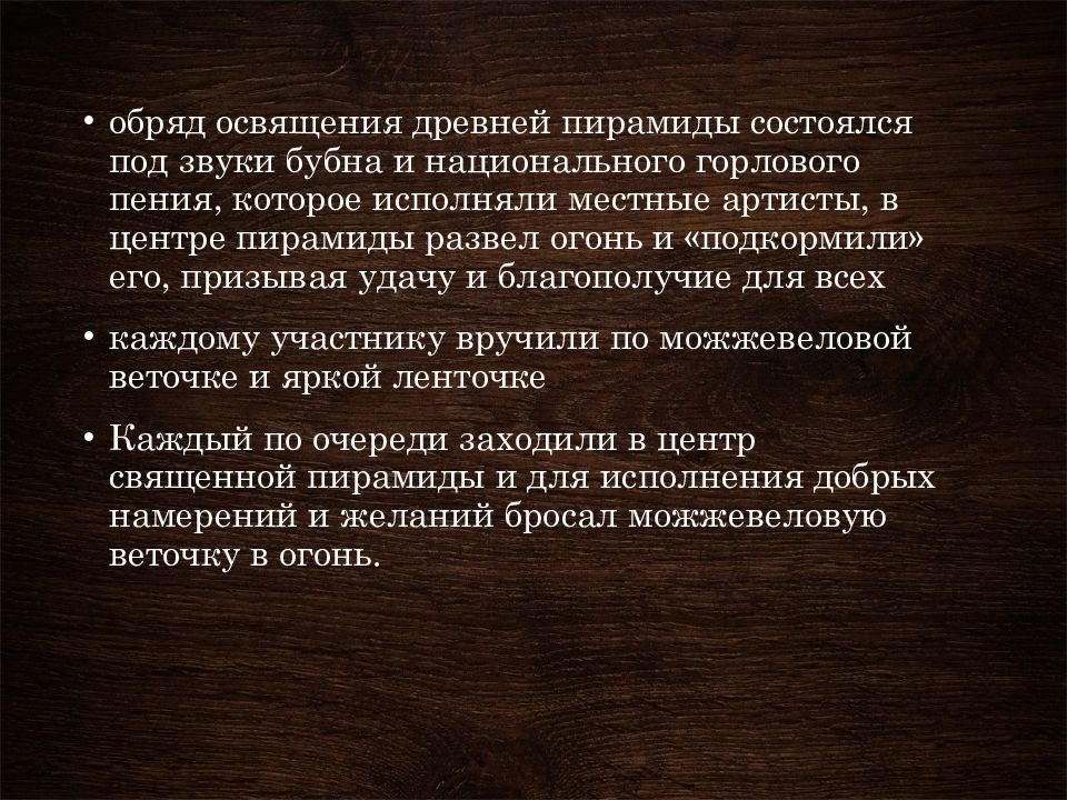 обряд освящения древней пирамиды состоялся под звуки бубна и национального горлового пения, которое исполняли местные артисты, в центре пирамиды развел огонь и « подкормили» его, призывая удачу и благополучие для всех каждому участнику вручили по можжевеловой веточке и яркой ленточке Каждый по очереди заходили в центр священной пирамиды и для исполнения добрых намерений и желаний бросал можжевеловую веточку в огонь.