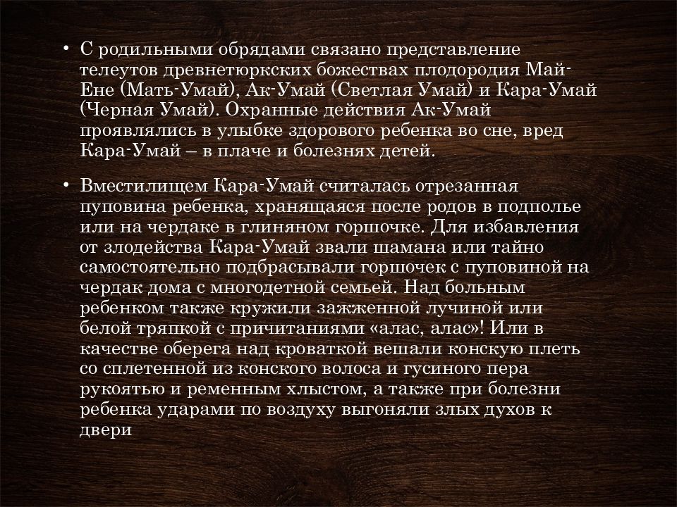 С родильными обрядами связано представление телеутов древнетюркских божествах плодородия Май-Ене (Мать-Умай), Ак-Умай (Светлая Умай) и Кара-Умай (Черная Умай). Охранные действия Ак-Умай проявлялись в улыбке здорового ребенка во сне, вред Кара-Умай – в плаче и болезнях детей. Вместилищем Кара-Умай считалась отрезанная пуповина ребенка, хранящаяся после родов в подполье или на чердаке в глиняном горшочке. Для избавления от злодейства Кара-Умай звали шамана или тайно самостоятельно подбрасывали горшочек с пуповиной на чердак дома с многодетной семьей. Над больным ребенком также кружили зажженной лучиной или белой тряпкой с причитаниями « алас, алас »! Или в качестве оберега над кроваткой вешали конскую плеть со сплетенной из конского волоса и гусиного пера рукоятью и ременным хлыстом, а также при болезни ребенка ударами по воздуху выгоняли злых духов к двери