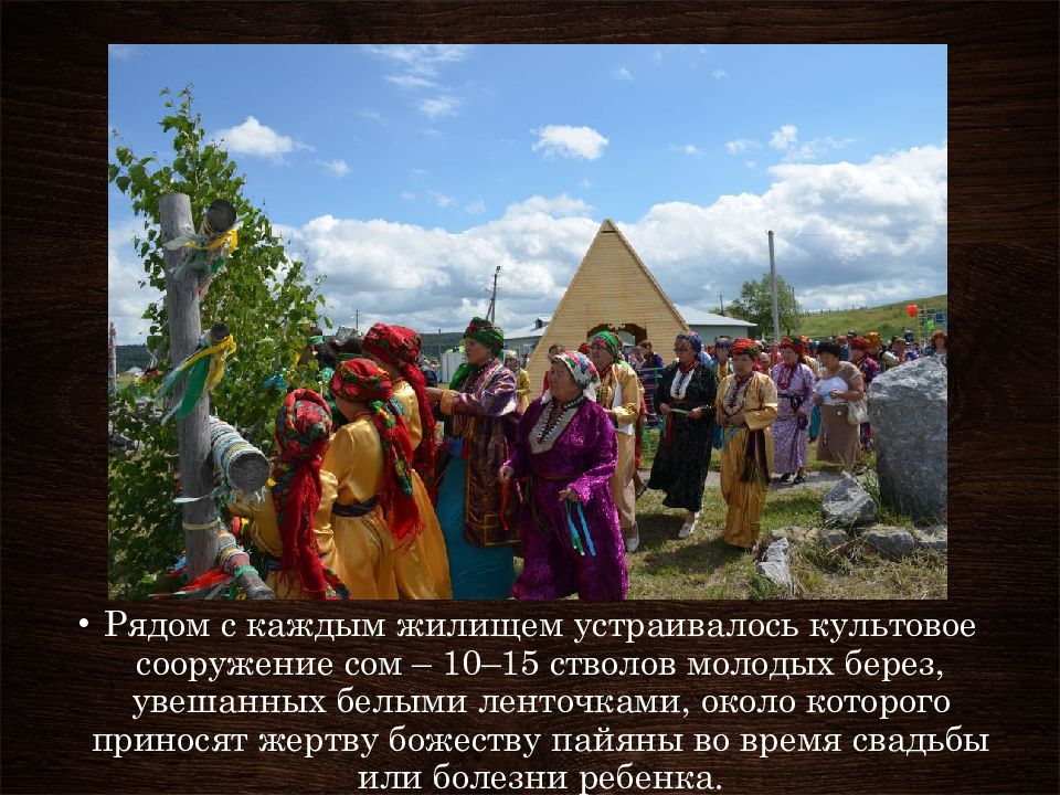 Рядом с каждым жилищем устраивалось культовое сооружение сом – 10–15 стволов молодых берез, увешанных белыми ленточками, около которого приносят жертву божеству пайяны во время свадьбы или болезни ребенка.