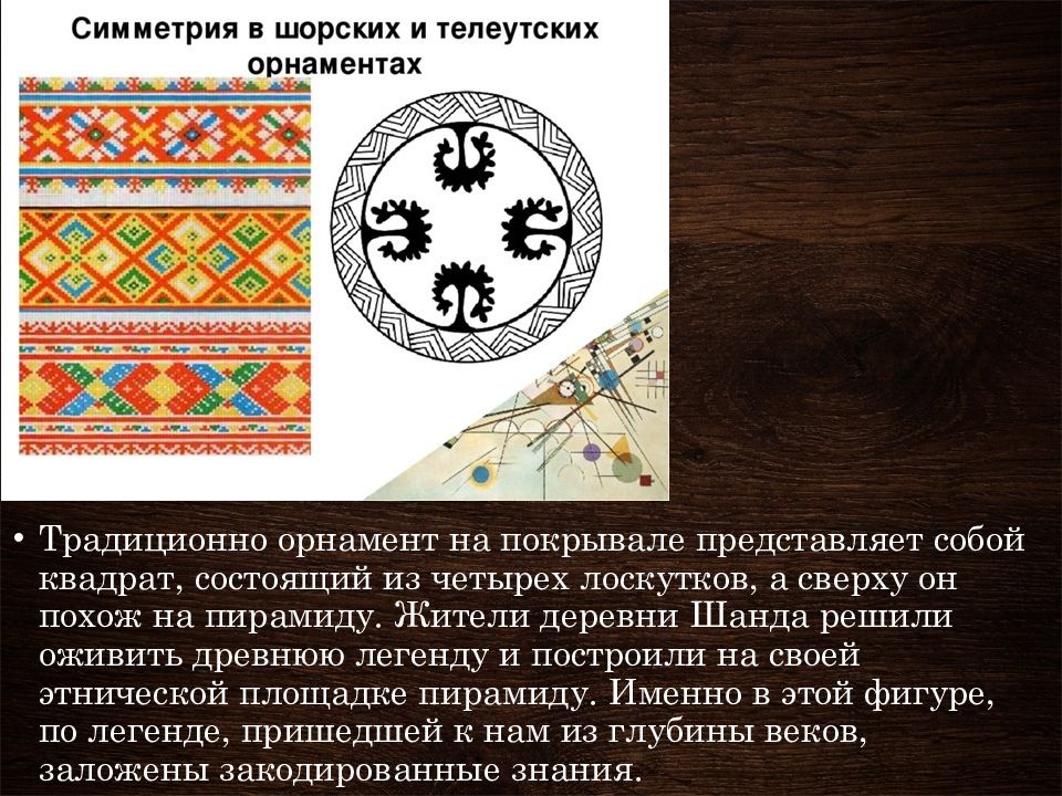 Традиционно орнамент на покрывале представляет собой квадрат, состоящий из четырех лоскутков, а сверху он похож на пирамиду. Жители деревни Шанда решили оживить древнюю легенду и построили на своей этнической площадке пирамиду. Именно в этой фигуре, по легенде, пришедшей к нам из глубины веков, заложены закодированные знания.
