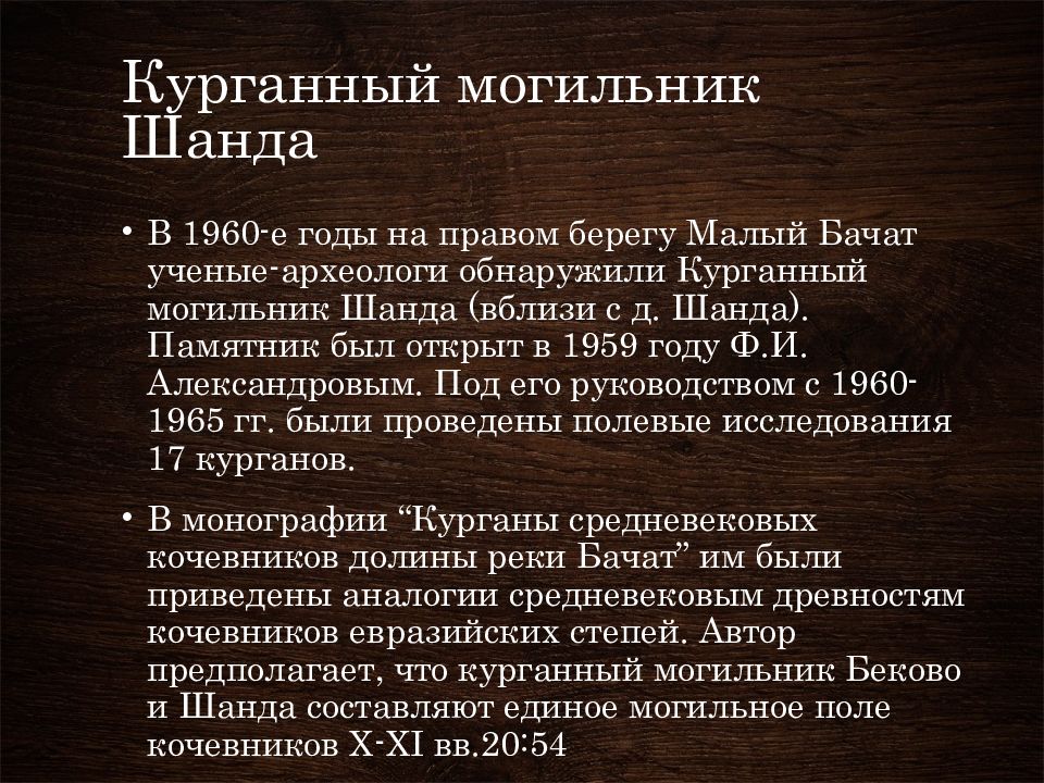 В 1960-е годы на правом берегу Малый Бачат ученые-археологи обнаружили Курганный могильник Шанда (вблизи с д. Шанда ). Памятник был открыт в 1959 году Ф.И. Александровым. Под его руководством с 1960-1965 гг. были проведены полевые исследования 17 курганов. В монографии “Курганы средневековых кочевников долины реки Бачат ” им были приведены аналогии средневековым древностям кочевников евразийских степей. Автор предполагает, что курганный могильник Беково и Шанда составляют единое могильное поле кочевников X-XI вв.20:54