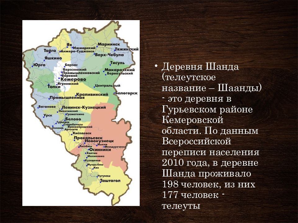 Деревня Шанда ( телеутское название – Шаанды ) - это деревня в Гурьевском районе Кемеровской области. По данным Всероссийской переписи населения 2010 года, в деревне Шанда проживало 198 человек, из них 177 человек - телеуты