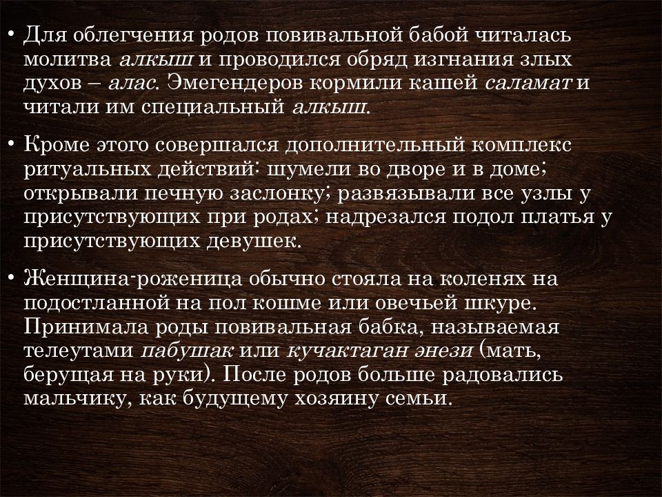 Для облегчения родов повивальной бабой читалась молитва алкыш и проводился обряд изгнания злых духов – алас. Эмегендеров кормили кашей саламат и читали им специальный алкыш. Кроме этого совершался дополнительный комплекс ритуальных действий : шумели во дворе и в доме; открывали печную заслонку; развязывали все узлы у присутствующих при родах; надрезался подол платья у присутствующих девушек. Женщина-роженица обычно стояла на коленях на подостланной на пол кошме или овечьей шкуре. Принимала роды повивальная бабка, называемая телеутами пабушак или кучактаган энези (мать, берущая на руки). После родов больше радовались мальчику, как будущему хозяину семьи.