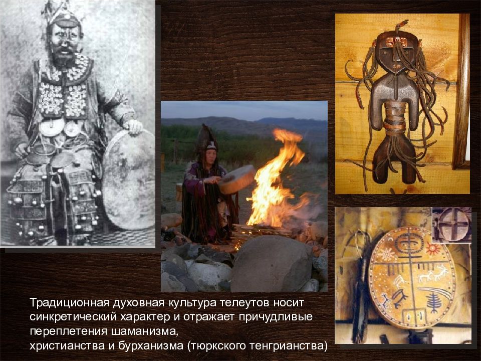 Традиционная духовная культура телеутов носит синкретический характер и отражает причудливые переплетения шаманизма, христианства и бурханизма (тюркского тенгрианства )
