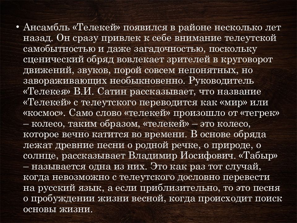 Ансамбль « Телекей » появился в районе несколько лет назад. Он сразу привлек к себе внимание телеутской самобытностью и даже загадочностью, поскольку сценический обряд вовлекает зрителей в круговорот движений, звуков, порой совсем непонятных, но завораживающих необыкновенно. Руководитель « Телекея » В.И. Сатин рассказывает, что название « Телекей » с телеутского переводится как «мир» или «космос». Само слово « телекей » произошло от « тегрек » – колесо, таким образом, « телекей » – это колесо, которое вечно катится во времени. В основе обряда лежат древние песни о родной речке, о природе, о солнце, рассказывает Владимир Иосифович. « Табыр » – называется одна из них. Это как раз тот случай, когда невозможно с телеутского дословно перевести на русский язык, а если приблизительно, то это песня о пробуждении жизни весной, когда происходит поиск основы жизни.