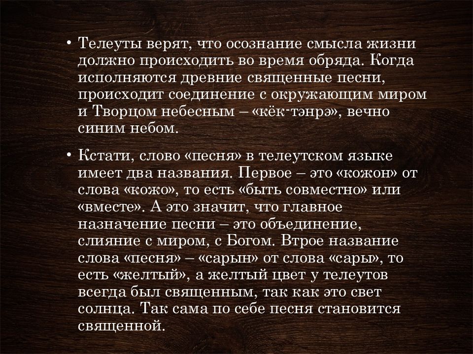 Телеуты верят, что осознание смысла жизни должно происходить во время обряда. Когда исполняются древние священные песни, происходит соединение с окружающим миром и Творцом небесным – « кёк-тэнрэ », вечно синим небом. Кстати, слово «песня» в телеутском языке имеет два названия. Первое – это « кожон » от слова « кожо », то есть «быть совместно» или «вместе». А это значит, что главное назначение песни – это объединение, слияние с миром, с Богом. Втрое название слова «песня» – « сарын » от слова « сары », то есть «желтый», а желтый цвет у телеутов всегда был священным, так как это свет солнца. Так сама по себе песня становится священной.