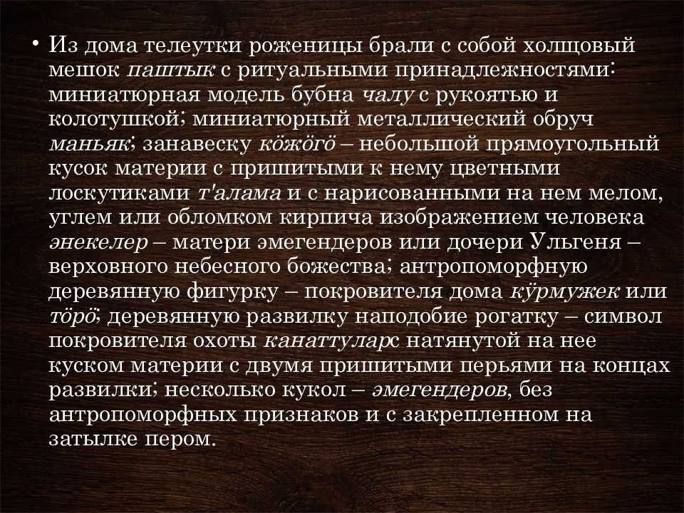 Из дома телеутки роженицы брали с собой холщовый мешок паштык с ритуальными принадлежностями: миниатюрная модель бубна чалу с рукоятью и колотушкой; миниатюрный металлический обруч маньяк ; занавеску кöжöгö – небольшой прямоугольный кусок материи с пришитыми к нему цветными лоскутиками т'алама и с нарисованными на нем мелом, углем или обломком кирпича изображением человека энекелер – матери эмегендеров или дочери Ульгеня – верховного небесного божества; антропоморфную деревянную фигурку – покровителя дома кÿрмужек или тöрö ; деревянную развилку наподобие рогатку – символ покровителя охоты канаттулар с натянутой на нее куском материи с двумя пришитыми перьями на концах развилки; несколько кукол – эмегендеров, без антропоморфных признаков и с закрепленном на затылке пером.