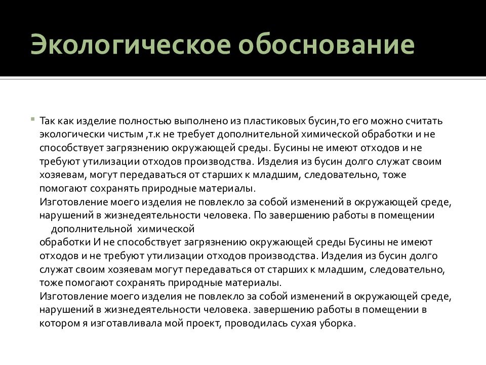 Так как изделие полностью выполнено из пластиковых бусин,то его можно считать экологически чистым,т.к не требует дополнительной химической обработки и не способствует загрязнению окружающей среды. Бусины не имеют отходов и не требуют утилизации отходов производства. Изделия из бусин долго служат своим хозяевам, могут передаваться от старших к младшим, следовательно, тоже помогают сохранять природные материалы. Изготовление моего изделия не повлекло за собой изменений в окружающей среде, нарушений в жизнедеятельности человека. По завершению работы в помещении дополнительной химической обработки И не способствует загрязнению окружающей среды Бусины не имеют отходов и не требуют утилизации отходов производства. Изделия из бусин долго служат своим хозяевам могут передаваться от старших к младшим, следовательно, тоже помогают сохранять природные материалы. Изготовление моего изделия не повлекло за собой изменений в окружающей среде, нарушений в жизнедеятельности человека. завершению работы в помещении в котором я изготавливала мой проект, проводилась сухая уборка.