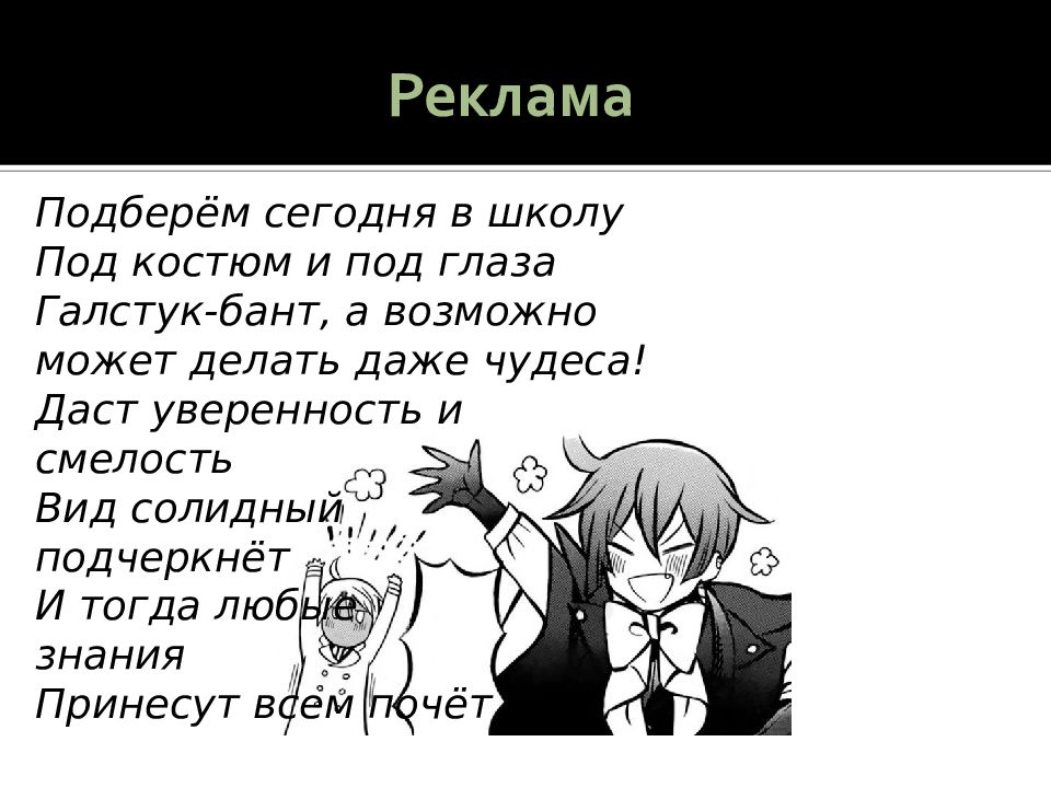 Подберём сегодня в школу Под костюм и под глаза Галстук-бант, а возможно может делать даже чудеса! Даст уверенность и смелость Вид солидный подчеркнёт И тогда любые знания Принесут всем почёт