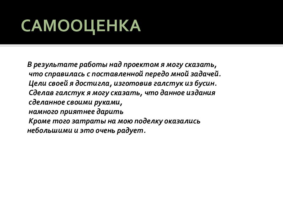 В результате работы над проектом я могу сказать, что справилась с поставленной передо мной задачей. Цели своей я достигла, изготовив галстук из бусин. Сделав галстук я могу сказать, что данное издания сделанное своими руками, намного приятнее дарить Кроме того затраты на мою поделку оказались небольшими и это очень радует.