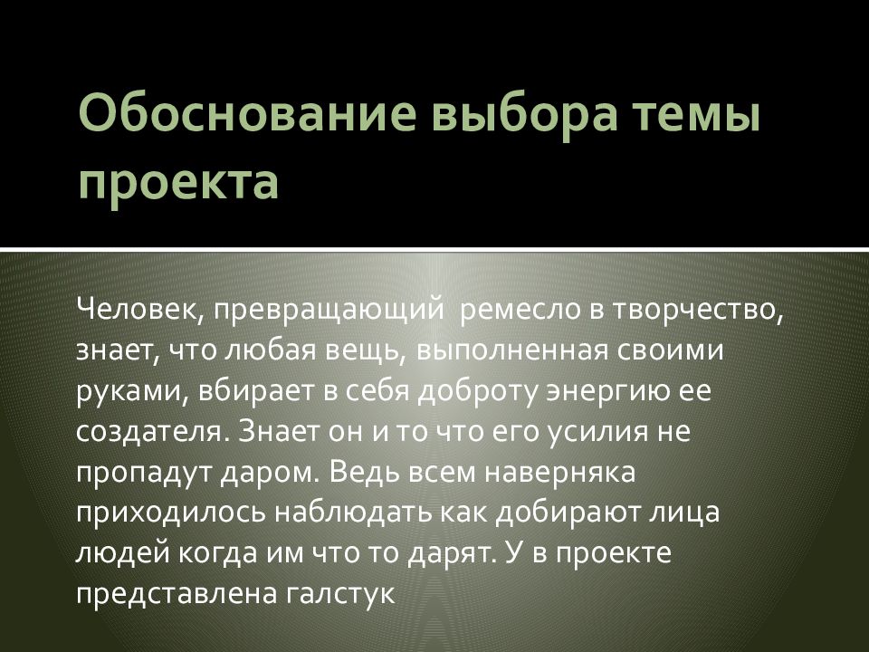 Человек, превращающий ремесло в творчество, знает, что любая вещь, выполненная своими руками, вбирает в себя доброту энергию ее создателя. Знает он и то что его усилия не пропадут даром. Ведь всем наверняка приходилось наблюдать как добирают лица людей когда им что то дарят. У в проекте представлена галстук